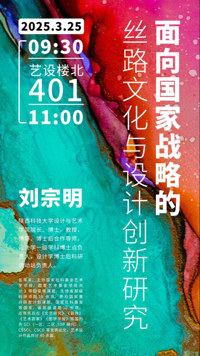 筑艺讲坛(一百七十五)《面向国家战略的丝路文化与设计创新研究》时间:9:30~11:00(2025年3月25日)地点:艺设楼北401面向人群:全校感兴趣的师生 刘宗明,男,1978年生,江西吉安人,中共党员。现任陕西科技大学设计与艺术色动漫 院长、博士,教授、博导、博士后合作导师,设计学一级学科博士点负责人,设计学博士后科研流动站负责人。江...