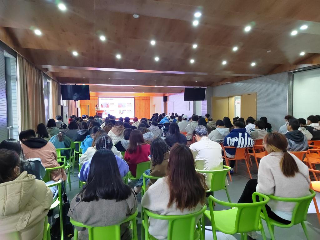 分团委书记汪正主持,实验中心主任杨媛主讲,全体辅导员、实验中心全体教师及100余名学生代表共同参加。