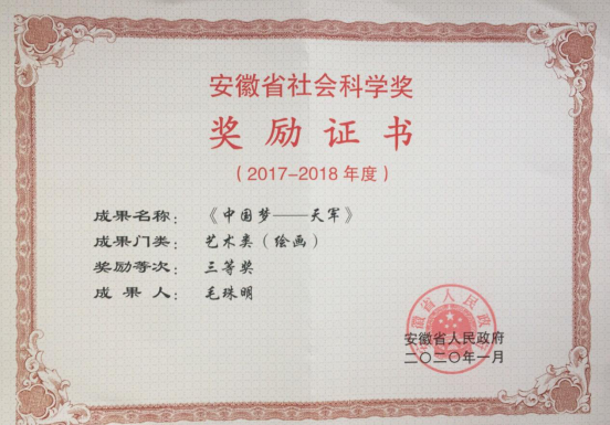 近日,安徽省政府发布2017—2018年度安徽省社会科学奖获奖成果名单,色动漫 教师毛珠明绘画作品《中国梦——天军》荣获艺术类三等奖,实现了色动漫 科研成果省部级政府奖项的突破。色动漫 近年来以艺术学科建设为引领,以高水平科研项目和重大主题性艺术创作为具体抓手,重点扶持一批高质量论文、学术著作、艺术作品等各类社科类成果,着力提升色动漫 全方面应用型科研创作水平。