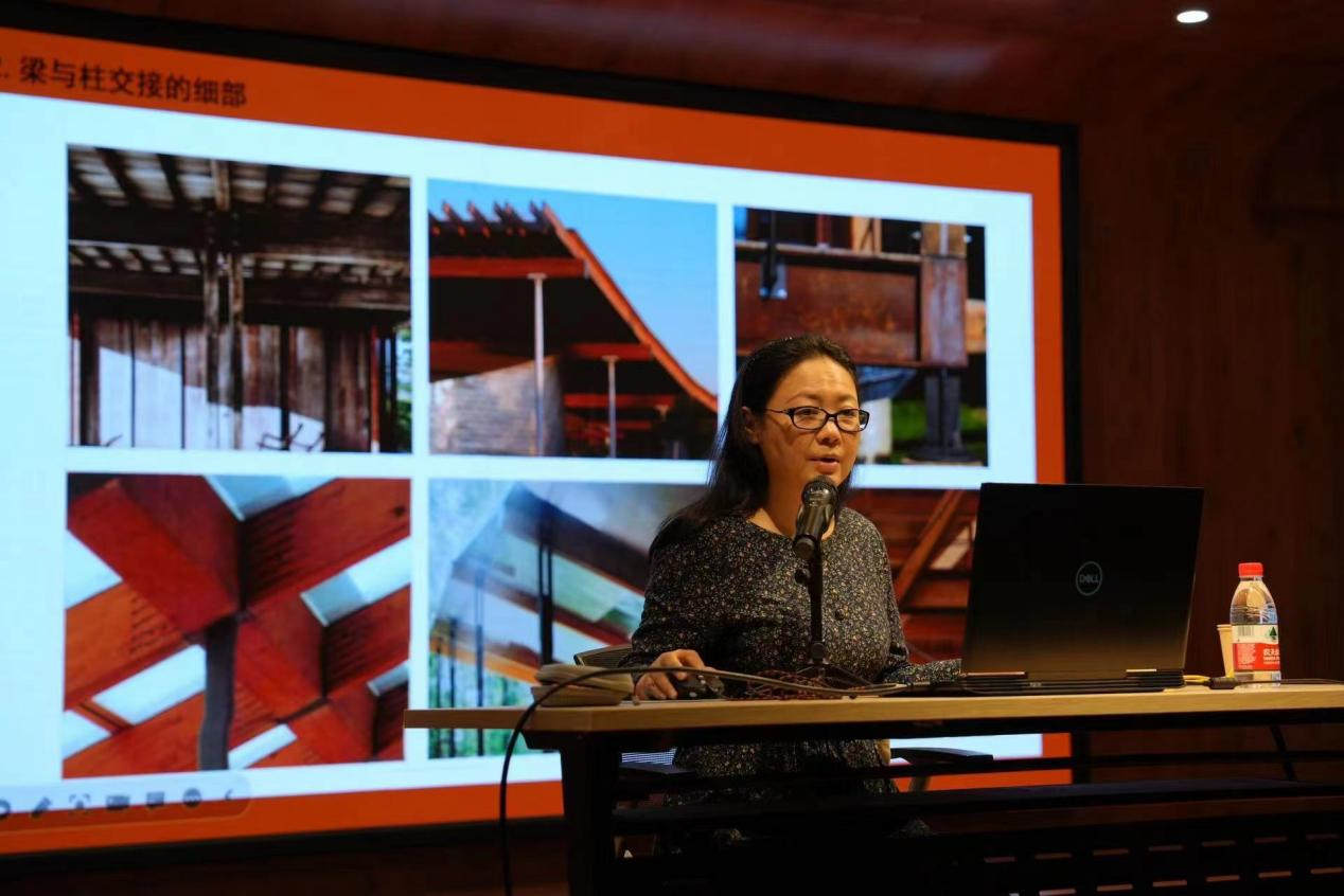 施煜庭教授从传统木结构构造技术、现代木结构构造技术、现代木结构建筑艺术三个维度给同学们展示了木结构发展演变历程。讲座中,施煜庭教授以其作品“闳约楼”为例,以中国昆曲文化和古戏台建筑的形制特征为研究对象,以现代装置艺术的视角为切入点,将昆曲戏台从大型的镜框式舞台转移至体量适中的戏台建筑中,在保留传统古戏台形制和特征建筑“意象”的同时,突显昆曲凝练和写意的艺术形式。该作品让在场人员深有触动。整场讲座深入浅出、内涵丰富,精彩的学术知识分享,让在座的师生受益匪浅,并获得了全体与会人员的热烈掌声。
