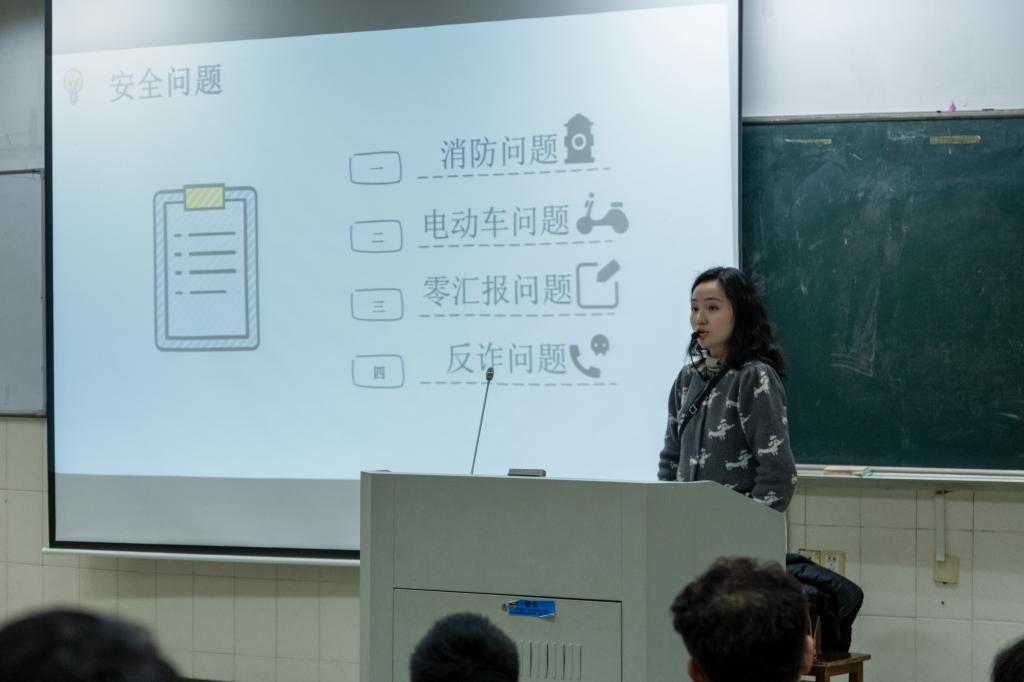 2022级辅导员秦艳秋重点围绕安全问题开展介绍,从宿舍消防安全管理规定到校园电动车集中存放政策解读,再到晚归“零汇报”制度实施和防范电信诈骗手段,秦艳秋对学生作出明确要求。
