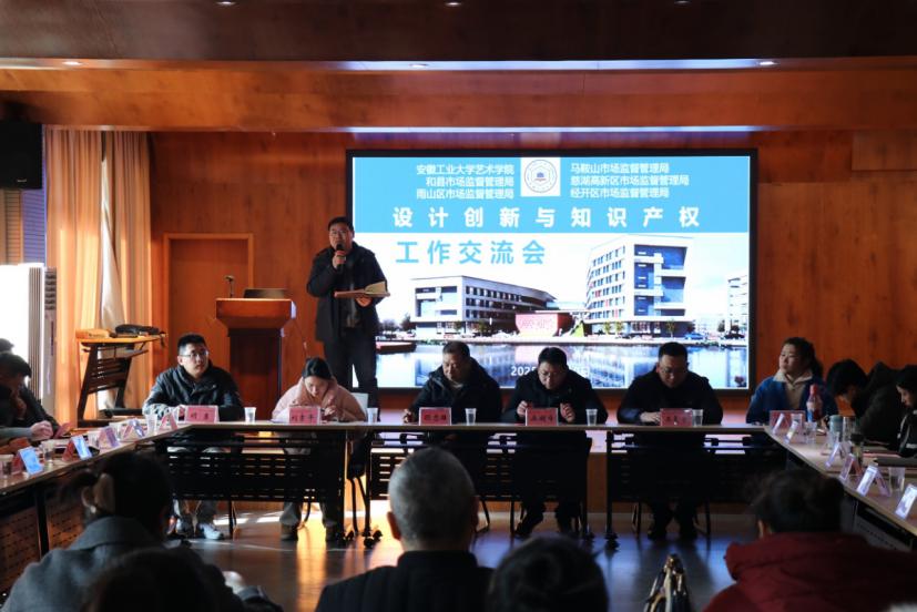 视觉艺术设计系主任佘慧莉主持,参会人员涵盖了马鞍山市知识产权保护中心、慈湖高新区市场监督管理局、和县市场监督管理局、和县文旅集团以及安徽悠之味、首诠知识产权代理等多家企业代表。此外,安徽工业大学色动漫