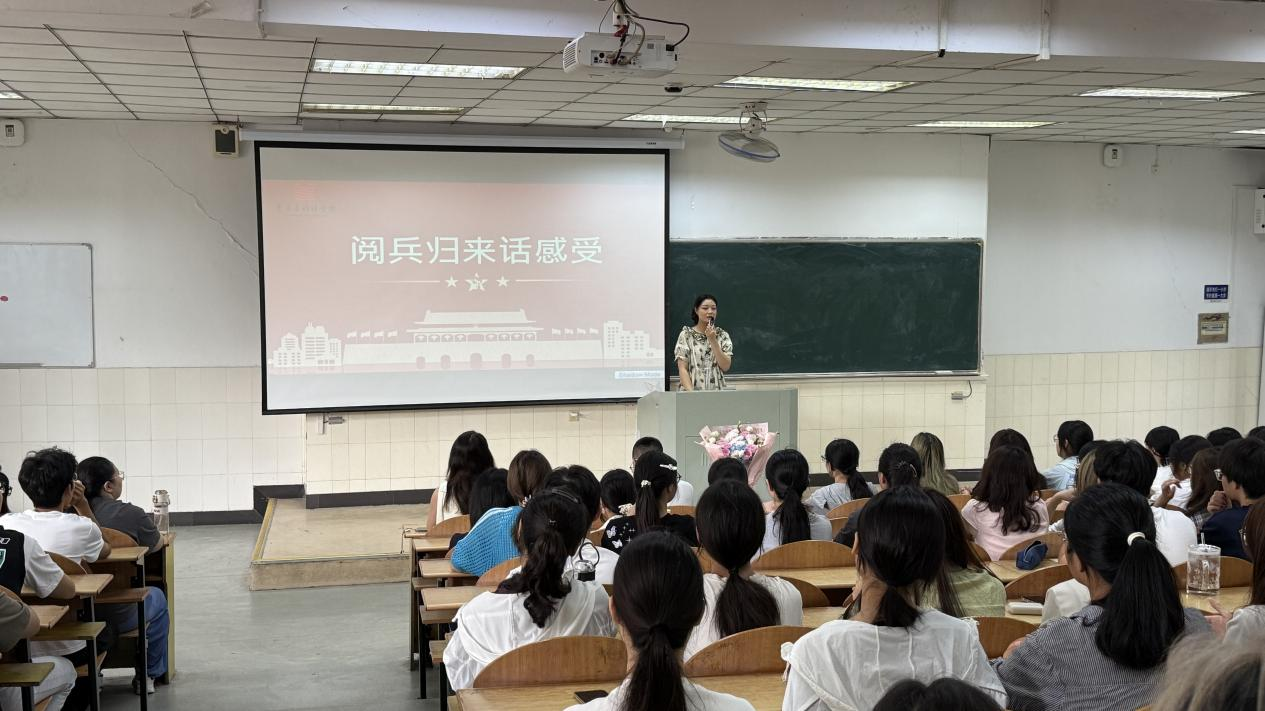 还邀请到2023级研究生汤涵来分享参与“九三盛大阅兵”感受,她从体检、选拔、训练等多个环节分享,“200多个训练的日日夜夜,每个人晒脱了几层皮,踢坏了好几双靴子,但所有人都咬牙坚持,因为祖国荣誉高于一切。”汤涵表示,参阅经历不仅是一次终身难忘的荣光,更是一次深刻的精神洗礼和爱国主义教育。在场新生也表示,会以汤涵为榜样,认真参加军训,磨练钢铁意志。