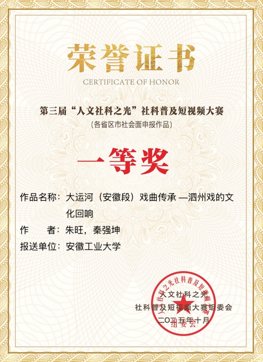 报送的作品《大运河(安徽段)戏曲传承——泗洲戏的文化回响》从众多参赛作品中脱颖而出,荣获全国一等奖。