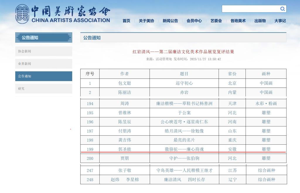 11月27日,由中国美术家协会、重庆市纪委监委、重庆市文学艺术界联合会、重庆高新区党工委及四川美术学院联合主办的“红岩清风——第二届廉洁文化美术作品展览”复评结果揭晓,我教师郭圣能的雕塑作品《徽骆驼——廉心商魂》成功入选为学党建与艺术创作融合再添佳绩