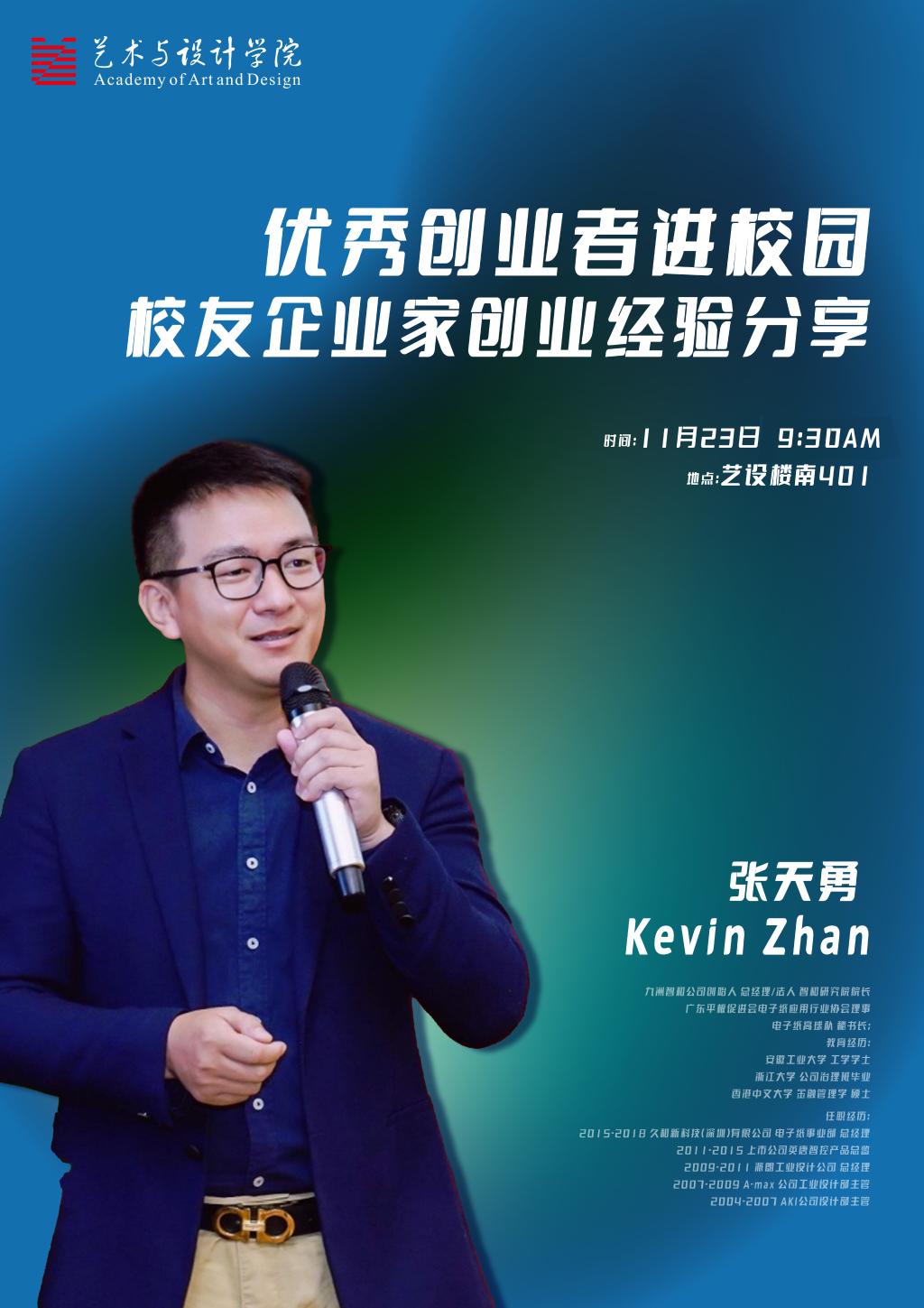 报告题目:优秀创业者进校园——校友企业家创业经验分享报告人:张天勇报告时间:2022年11月23日9:30报告地点:艺设楼401报告对象:色动漫 本科生、研究生报告人简介:张天勇,毕业于安徽工业大学工业设计专业,九洲智和公司创始人、总经理、法人,智和研究院院长 ,广东平板促进会电子纸应用行业协会理事,电子纸高球队秘书长。