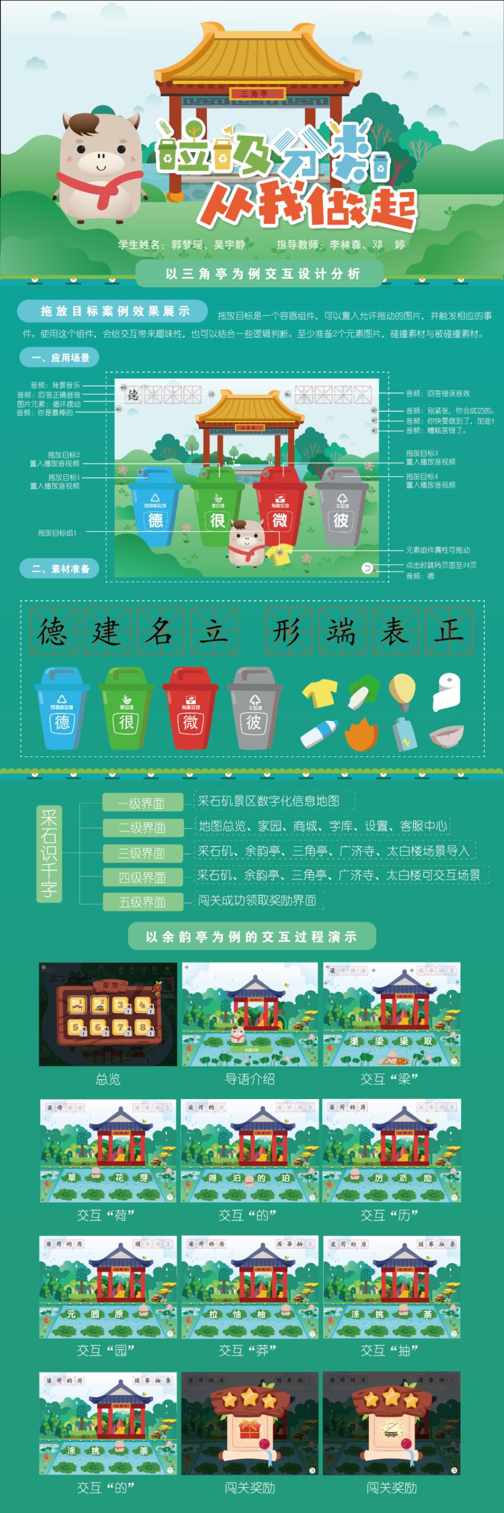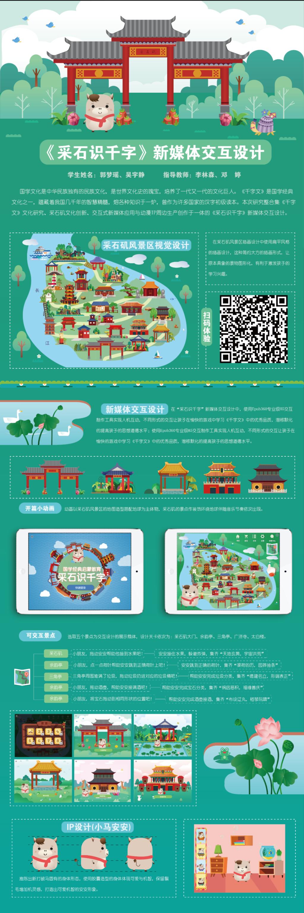 设计说明:本次研究整合集《千字文》文化研究、采石矶文化创新、交互式新媒体应用、动画IP周边生产创作于一体的《采石识千字》新媒体交互设计。作品将设计、文化、教育相融合,致力打造一款为小学生群体喜爱的学习互动平台,塑造《采石识千字》品牌,促进《千字文》文化的实质性升级,丰富马鞍山“诗城”的文化底蕴。