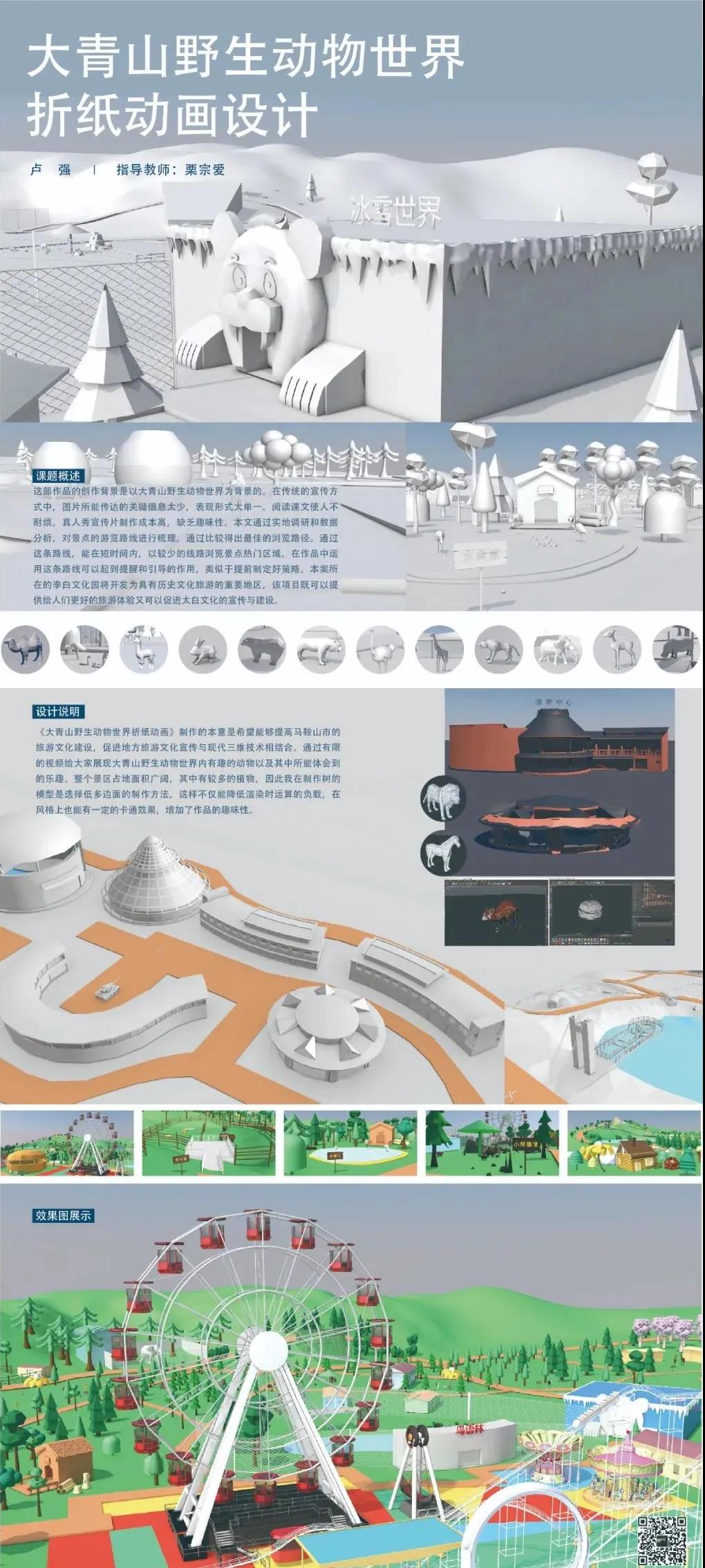 设计说明:《大青山野生动物世界折纸动画》制作的本意是希望能够提高马鞍山市的旅游文化建设,促进地方旅游文化宣传与现代三维技术相结合。通过有限的视频给大家展现大青山野生动物世界内有趣的动物以及其中所能体会到的乐趣。整个景区占地面积广阔,其中有较多的植物,因此我在制作树的模型是选择低多边面的制作方法;对场景中的建筑、植物以及部分动物制作折纸动画效果增加了作品的趣味性。