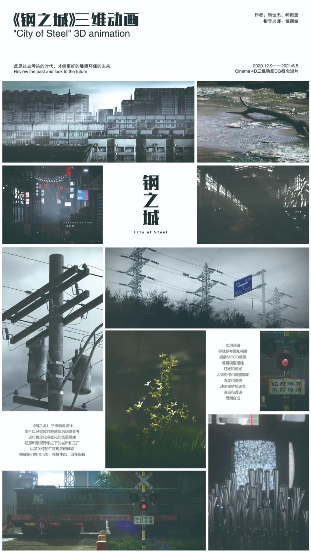 设计说明:本片以马钢废弃的遗址为场景参考,进行概念化夸张化的场景搭建,还原和展现污染之下的城市和工厂,以及关停的厂区现在的样貌,提醒我们整治污染、修复生态、迫在眉睫。引导人们去思考人与工业与自然之间的关系。