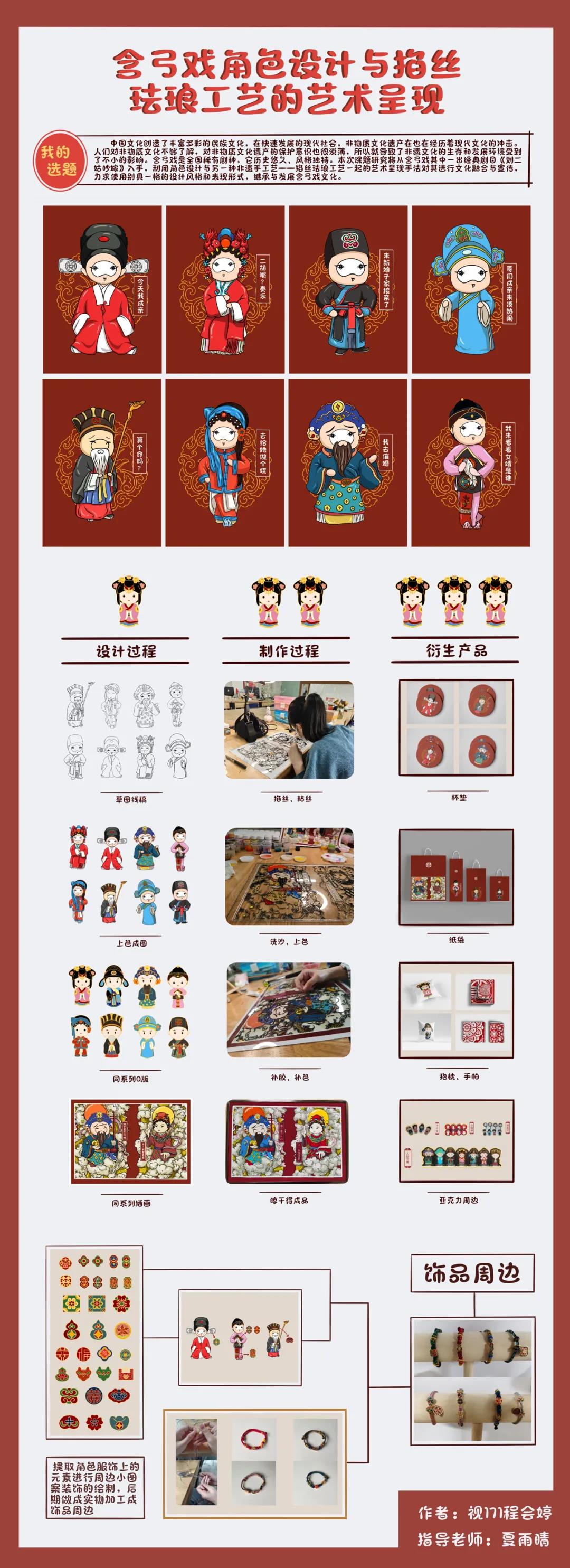 设计说明:发展含弓戏不仅因为它凝聚着民族的精神文化,也是因为含弓戏的文化里积淀了中国艺术的精华,还能够传载浓郁的民族审美情趣、传统道德理念和价值取向。继承与发展含弓戏文化,不仅可以提升文化创意产品的吸引力,同时也赋予了非物质文化遗产新的活力。利用角色设计与另一种非遗手工艺——掐丝珐琅工艺一起的艺术呈现手法对其进行文化融合与宣传,力求使用别具一格的设计风格和表现形式。