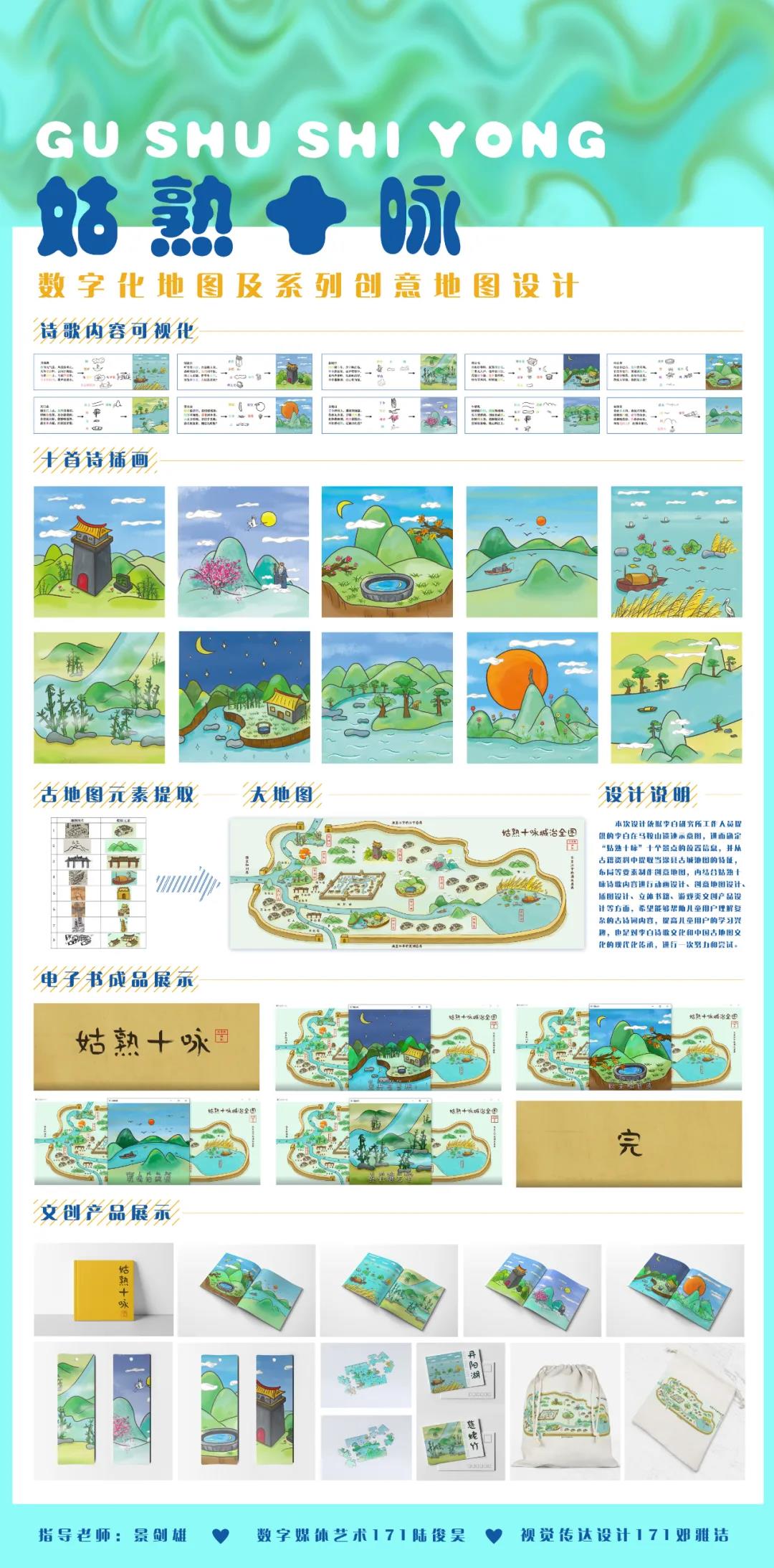 设计说明:本次设计依据李白研究所工作人员提供的李白在马鞍山遗迹示意图,进而确定“姑熟十咏”十个景点的位置信息,并从古籍资料中提取当涂县古城池图的特征,布局等要素制作创意地图,再结合姑熟十咏诗歌内容进行动画设计、创意地图设计、插图设计、立体书籍、游戏类文创产品设计等方面,希望能够帮助儿童用户理解复杂的古诗词内容,提高儿童用户的学习兴趣,也是对李白诗歌文化和中国古地图文化的现代化传承,进行一次努力和尝试。