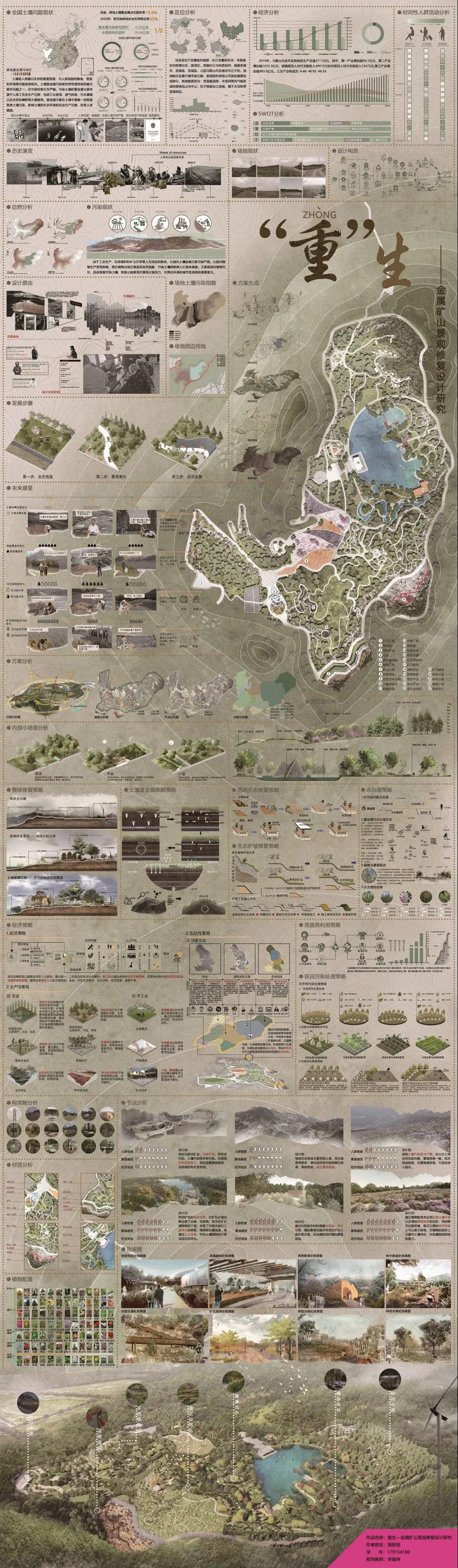 设计说明:自然景观一旦遭受破坏,再修复自己则是一个漫长的过程。尊重原有抬升的地形,在山地上进行分段设计,使整个场地与快节奏得城市生活隔离。通过修复手段与景观营造生态得到恢复,村民有了可以娱乐的去除,孩子们有了嬉耍的空间。