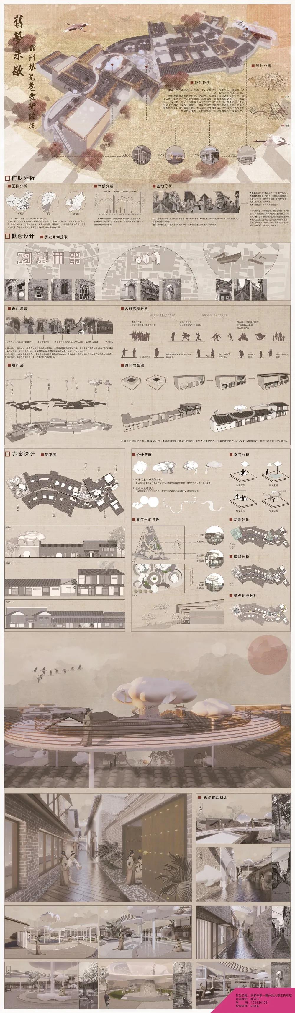 设计说明:本作品构设了功能区域分明、多样行径配以无障碍系统的老年活动休闲公共空间。秉承共生、共存、共享、共情的理念,在保留菜场贩卖功能的基础上提供自然舒适又利于满足老年群体精神需求、增进老年社区人际关系的场地。