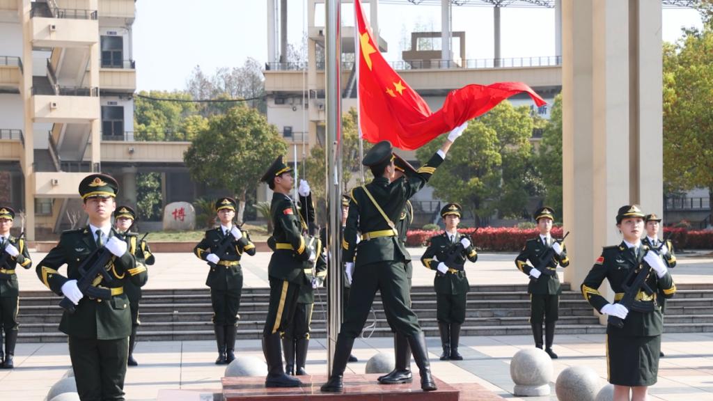 整齐划一的脚步声踏入明媚的春光,庄严的国歌声响起,扬旗手振臂有力地高挥,国旗随旭日冉冉升起。在那抹鲜亮的红色下,学生代表朗诵革命烈士家书,字字深沉、振聋发聩,字里行间尽抒家国大爱,烈士们的壮志热血染红了国旗,晴朗了大地。