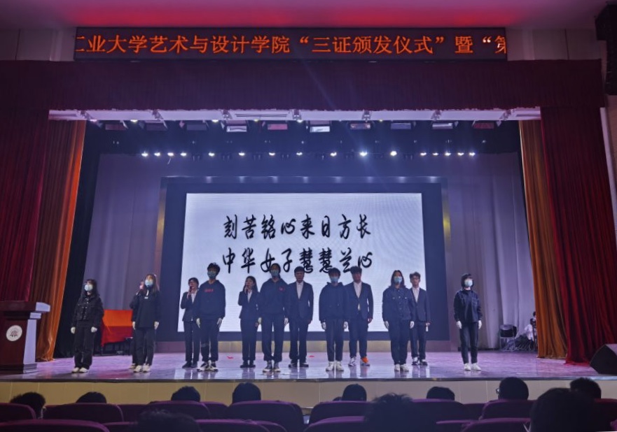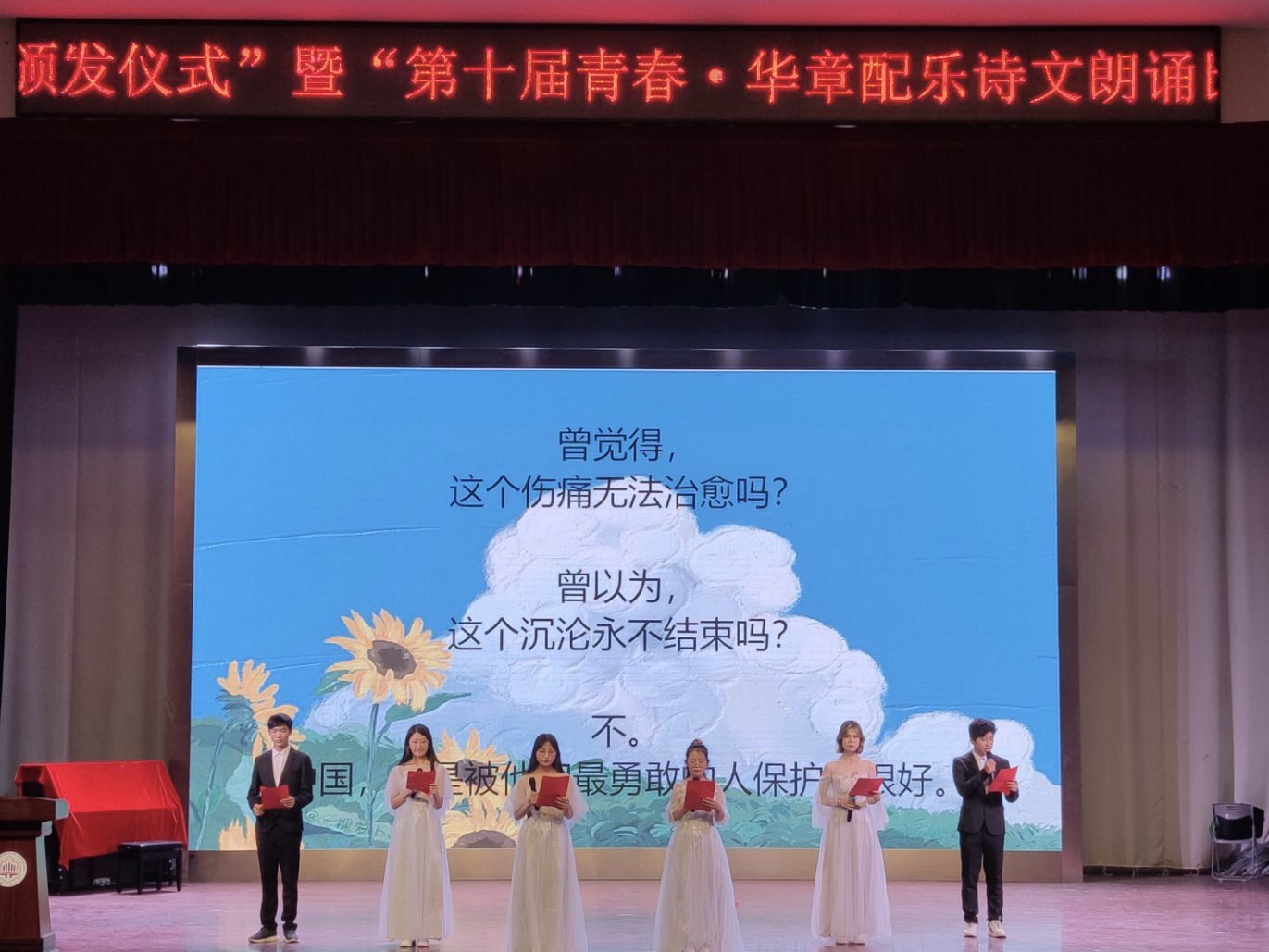 三证颁发仪式结束,“青春华章”配乐诗朗诵比赛随后而至。比赛现场,选手们各展风采,以其铿锵有力的气势、饱满充沛的情感和自信大方的姿态传达出对于奋战在抗疫一线的青年工作者们的敬重,展现了对于青春、磨砺、奋斗三者关系的深刻理解。经过精彩角逐,环境203班《白衣》获得一等奖,数媒201班《星河依旧,山河无恙》和工设202班《因为有你》获得二等奖,工设201班《赞抗疫英雄》和工设203班《致敬!最美逆行者》获得三等奖。最后,评委为获奖班级颁发证书并合影留念。